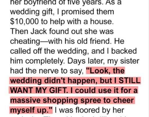 A woman’s sister was set to marry Jack, and she offered them $10,000 as a wedding gift. But before the big day, Jack discovered the sister’s affair and canceled everything. Instead of remorse, the sister demanded the money for a shopping spree. Refusing, the woman told her to face the consequences of her choices. Over time, the sister humbled herself, apologized to Jack, and accepted responsibility. Though the wedding never happened, she learned a hard but valuable lesson—that accountability matters more than money.