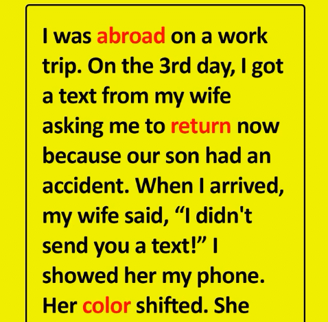 While on a work trip, a husband suddenly got a text from his wife: “Come home now, our son had an accident.” Panicked, he rushed back — only for his wife to insist she never sent it. Her face turned pale when he showed her the message.