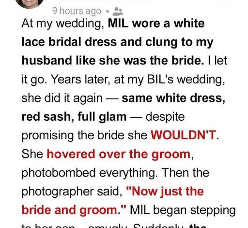 At my wedding, my MIL Linda wore a full-length white lace gown and clung to my groom. Years later, at my BIL’s wedding, she did it again—same dress, this time with a red sash.
