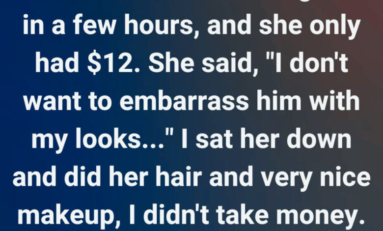 It was early morning when the door to my salon creaked open. A trembling woman stepped inside, clutching a small, worn-out purse. Her eyes were red from crying, her clothes plain and faded. In a soft, shaky voice, she said, “My son is getting married in a few hours. I only have twelve dollars. Could you please help me look presentable?”