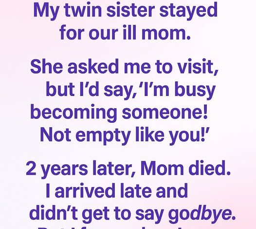 At eighteen, I left our small hometown with a suitcase full of dreams and a heart set on success. My twin sister, Emma, stayed behind to care for our mother, who had fallen ill. Every time she asked me to visit, I’d brush her off with the same cold line: “I’m busy becoming someone. Not stuck like you.”