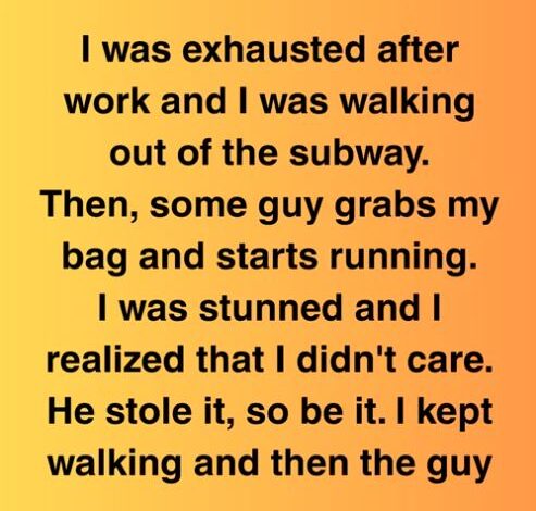 I was exhausted after work, leaving the subway, when a guy grabbed my bag and ran. I didn’t even care—until he stopped. He looked inside, saw only a lunchbox, pens, and a dying phone charger, then walked back. “You want this?” he asked.