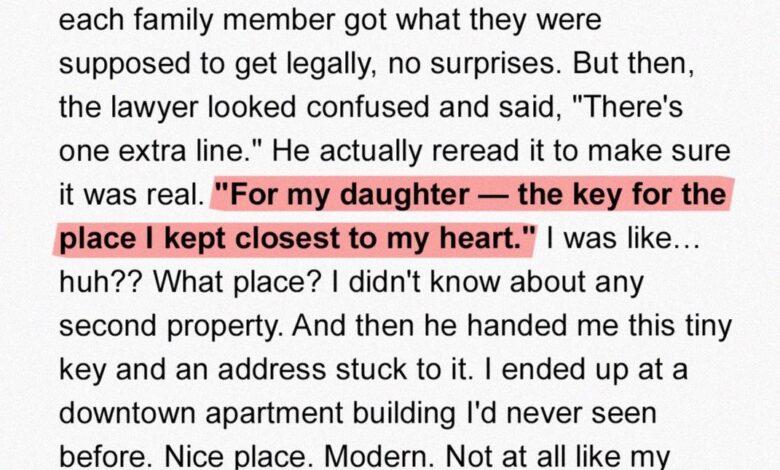 My dad passed away a few months ago, and settling his estate seemed straightforward. At the reading of his will, everyone received what they expected — no surprises. But then the lawyer hesitated and read an extra line aloud: “For my daughter — the key for the place I kept closest to my heart.” He handed me a small, worn key attached to a slip of paper with an address. My stomach churned with questions as I followed the address to a modern downtown apartment building that didn’t match my dad’s simple, country lifestyle.
