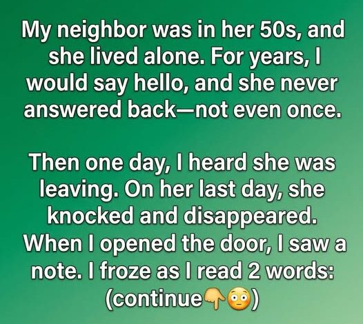 After reading the note, I stood quietly in my doorway for a long time. I realized how easy it is to misunderstand silence and how many stories remain hidden behind closed doors. Her lack of response had never been rejection—it was something deeply personal I could not have known. In the following weeks, her house stood empty, but her message stayed with me. It changed how I looked at brief interactions and small gestures. Sometimes, a simple greeting matters more than we realize. Even when it feels unnoticed, kindness can still reach someone in ways we may never fully see.