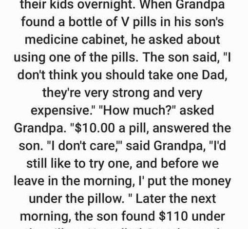He was shocked to discover $110 hidden beneath the pillow. He shouted to Grandpa, bewildered, “I told you each pill was $10, not $110!” “I know, but I wanted to make sure I had enough for the experience,” Grandpa said with a laugh.