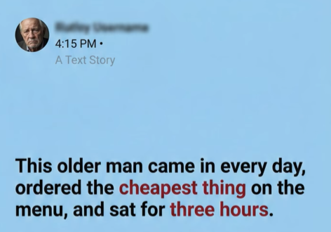 An elderly man visits a restaurant every day, ordering the cheapest meal and quietly sitting for hours. Though some complain, a worker lets him stay and secretly offers extra food. When he suddenly stops coming, his daughter returns with a note after his death—revealing those hours were the only time he didn’t feel alone. Touched, the restaurant creates a quiet rule: anyone who orders little and lingers is always welcome, because sometimes people aren’t wasting space—they’re searching for dignity.
