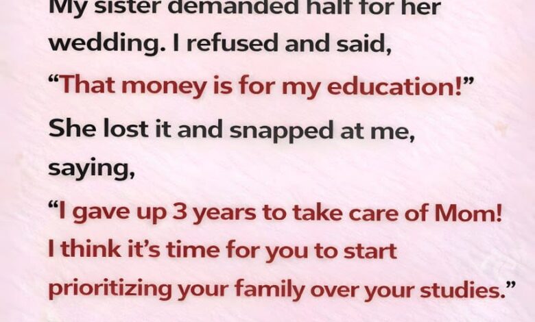 She sat down across from me and got straight to the point. “I want half of the money Mom left you. Weddings are expensive, and since I gave up three years of my life to take care of her, I think it’s fair.”