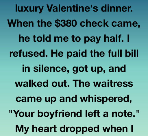 My boyfriend insisted on a luxury Valentine’s dinner. When the $380 check came, he told me to pay half. I refused. He paid the full bill in silence, got up, and walked out. The waitress came up and whispered, “Your boyfriend left a note.” My heart dropped when I read it. It said, “Since you don’t believe in investing equally, maybe you’re not ready for a partnership. Think about that.”