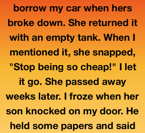 I let my elderly neighbor borrow my car when hers broke down. She returned it with an empty tank. When I mentioned it, she snapped, “Stop being so cheap!” I let it go. She passed away weeks later. I froze when her son knocked on my door. He held some papers and said, “I think we need to talk about my mother.”