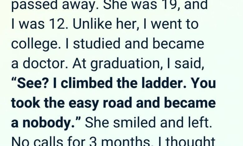 Years passed. The narrator went to college, excelled in medical school, and built what looked like a successful life. At her graduation, she mocked her sister, calling her a “nobody” who had taken the easy path — a comment that hurt deeply but her sister didn’t protest; she just smiled and walked away.