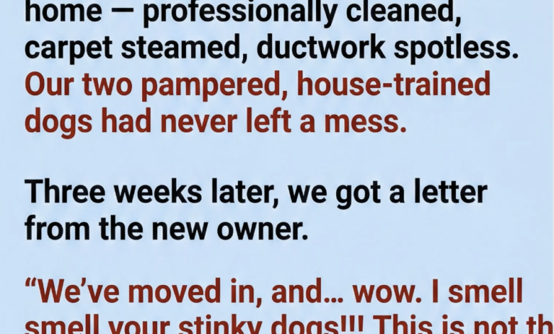 Three weeks later, a letter arrived. Written in loopy handwriting, it accused our “stinky dogs” of ruining the carpets. Mrs. Campbell claimed she couldn’t meditate without nausea, demanded $10,000 for replacements, and signed off with “Namaste.” Her husband added that the smell disrupted his hot yoga recovery.