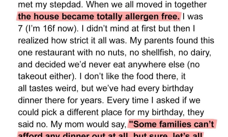 When I was seven, my life changed after my mom married Arnold, who had two children with serious food allergies. He insisted our entire household eliminate all dairy, nuts, and seafood, claiming even tiny crumbs were dangerous. Because of this, I spent nine years eating food I couldn’t stand — bland, plant‑based meals at a single allergen‑free restaurant — while my own tastes and social life were ignored.