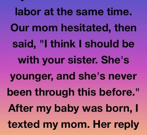 My sister and I went into labor at the same time. Our mom hesitated, then said, “I think I should be with your sister. She’s younger, and she’s never been through this before.” After my baby was born, I texted my mom.